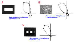 V1 is the first site where strong orientation and direction selectivities are observed in the macaque monkey (Hubel and Wiesel, 1968). While the vast majority of V1 cells show some degree of orientation selectivity, only approximately 25-35% of V1 cells are strongly directionally selective (Schiller et. al., 1976; DeValois et al., 1982). The classic method for testing orientation and direction selectivity is to measure the spike rate of a single cell in response to drifting oriented luminance bars and/or drifting luminance spots (see Figure 21).